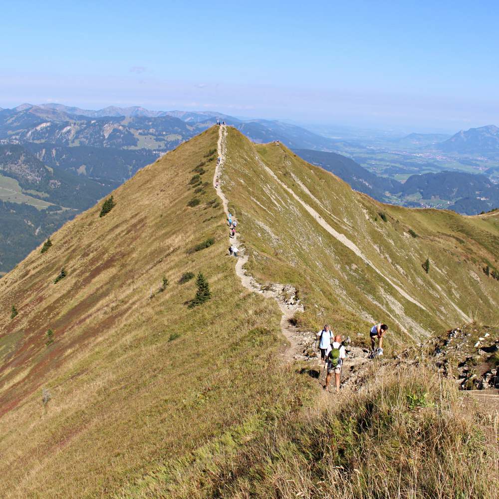 Auf dem Gipfel angekommen, versuchen wir erst mal den Massen an Wander-Senioren zu entkommen. Zum Merken: Zu dieser Jahreszeit (Ende September) scheint das Allgäu ein Rentner-Mekka zu sein. Ich find‘ das ja gut, dass die sich noch alle mit weit jenseits der 70 auf die höchsten Gipfel wagen! Aber der ein oder andere überschätzt schon mal seine Fähigkeiten ein wenig. Auf gerader Fläche ist das Laufen noch halbwegs easy, aber auf der Gratwanderung zwischen den Gipfeln oder den steileren Passagen blockieren die rüstigen Jungs und Mädels dann doch öfters mal den Weg…