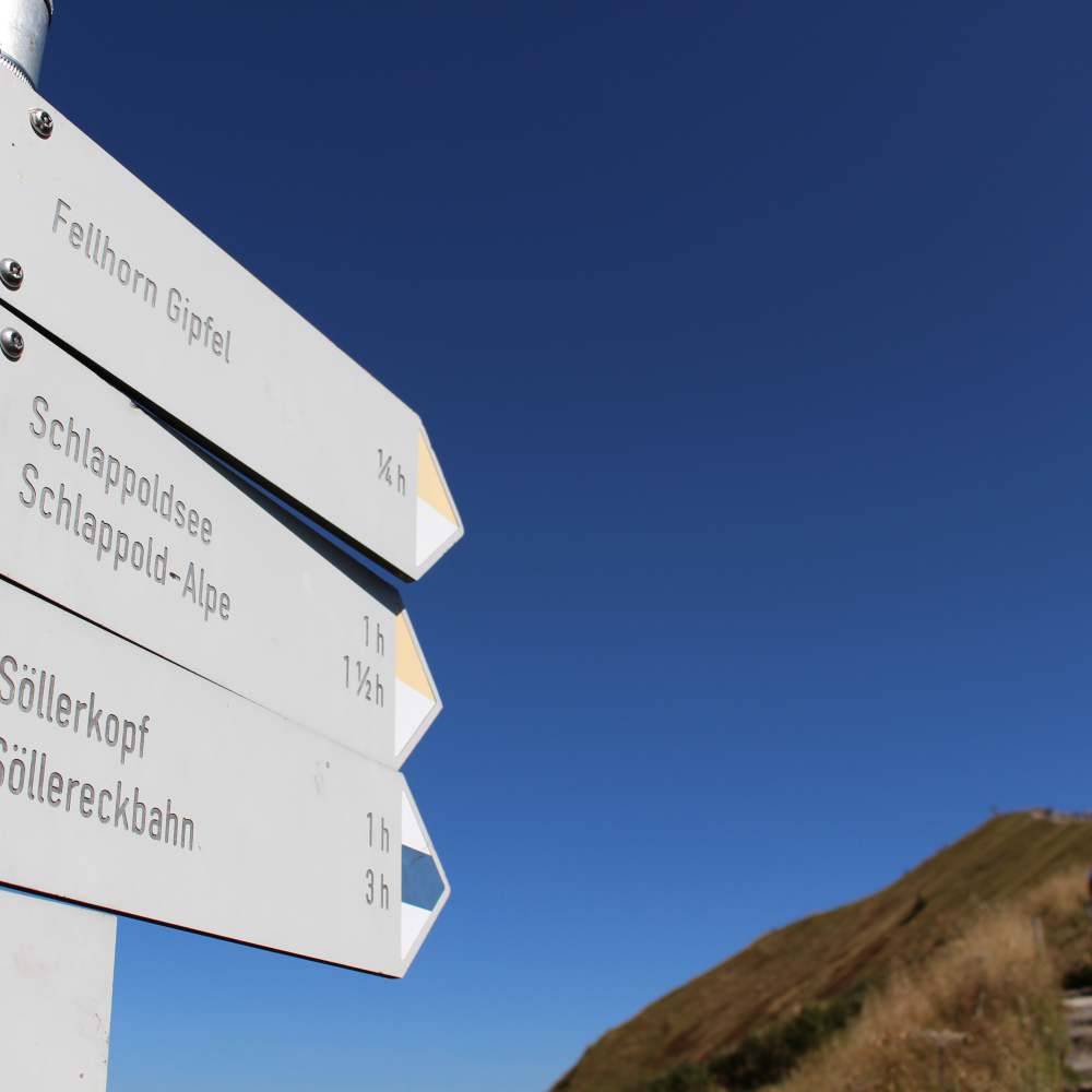 Das Söllereck ist 1706 m hoch und damit einer der eher kleineren Berge. Das Söllereck ist ein teilweise bewaldeter Grasberg. Er nennt sich selbst „der Familienberg“, was eher auf das einfache Skigebiet hinweist. Wir fahren hier sehr entspannt in einer leeren Gondel zum Gipfel, wandern von dort aus am Söllerhaus vorbei und folgen dem Wegweiser Richtung Söller-Alpe. Die Strecke führt zunächst gemächlich steigend durch den Wald, dann führt sie entspannt auf gleichbleibender Höhe am Hang entlang und gewährt wunderschöne Blicke ins Tal. Ein schöner, entspannter Weg! Die Söller-Alpe (Gasthaus) war unser Endpunkt, von hier aus geht ein steiler Weg den Hang weiter hinauf und man kann bis zum Fellhorn auf alpinem Gelände weiter laufen.
