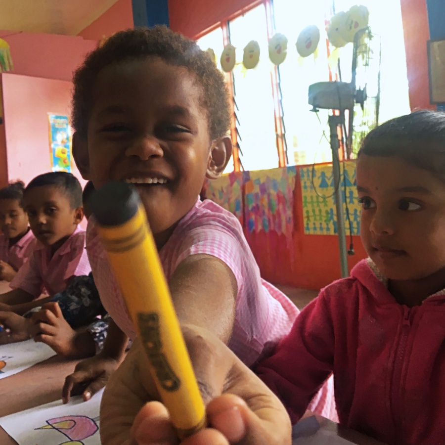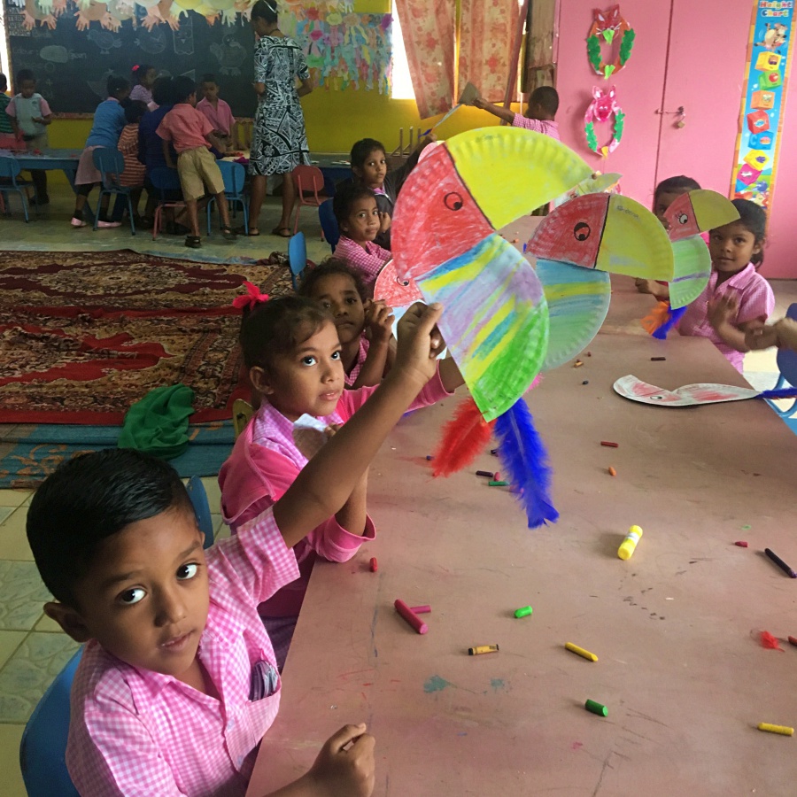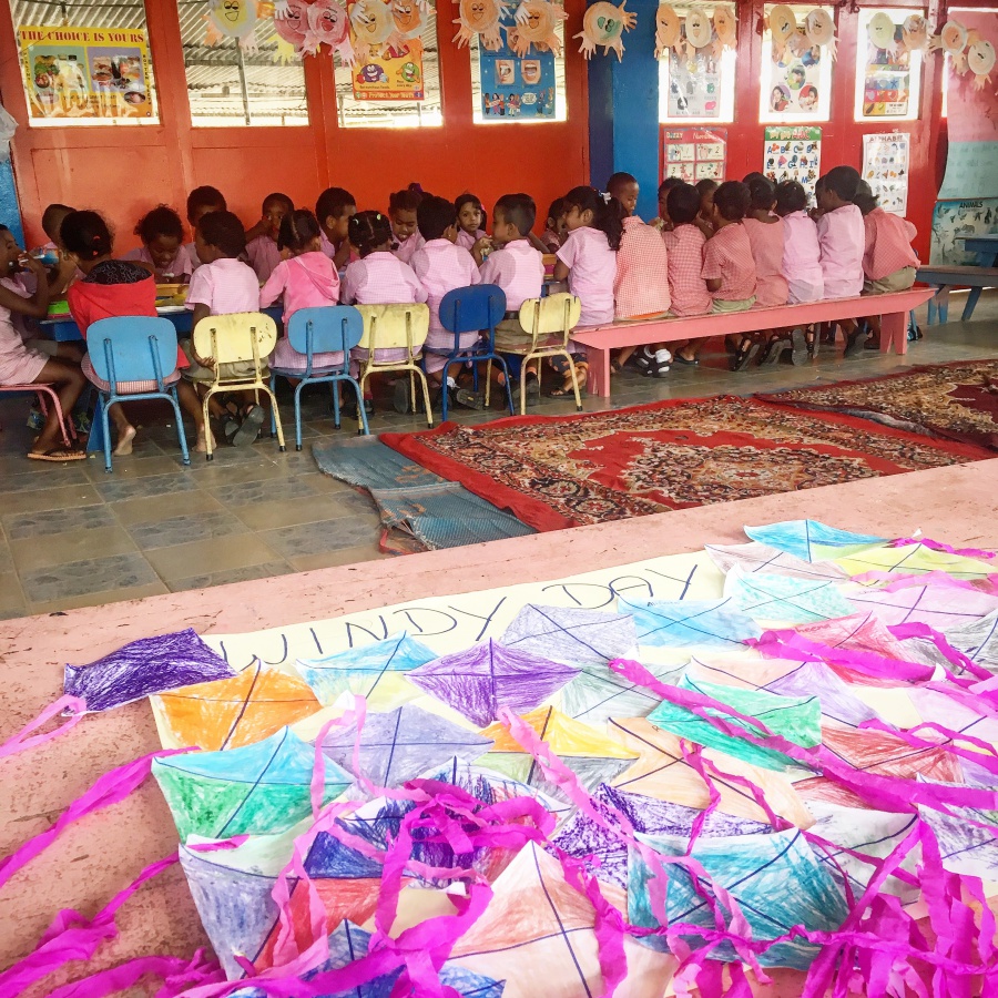 Mein erster Eindruck: Die Kinder sind süß und tragen alle eine recht ordentliche rosa karierte Uniform. Sie sind zur Hälfte fidschianischer Abstammung, zur anderen Hälfte indischer Abstammung (das wusste ich vorher auch nicht, fast die Hälfte der Einwohner auf Fidschi stammen von den Indern ab, die während der Kolonialisierung hierher verschifft wurden). Der Kindergarten selber ist recht hübsch und gross, es hängen viele bunte Bilder an den Wänden, an kleinen Tischen sitzen die Kinder in Gruppen und malen mit Kreide auf ihre Tafeln. Es wirkt friedlich.